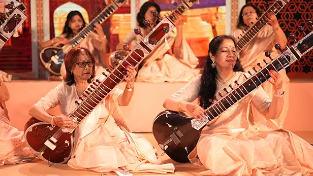 This concert features a group of 15+ talented women sitarists & vocalists along with renowned Tabla players. What's intriguing is that hardly any of the performing women are professional musicians; they come from diverse backgrounds - from teachers and medical practitioners to entrepreneurs, homemakers, and artists. The renditions include bhajans and Indian classical compositions. The Divine Strings concert has a duration of 60 minutes.